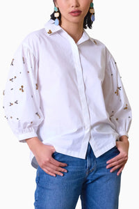 A timeless white cotton poplin shirt with delicate embellishments adorning the collar and sleeves. The subtle puffed sleeves add a refined touch, making it a versatile choice for both formal and casual chic looks.