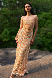 Featuring a straight fit silhouette, this elegant gown is adorned with delicate sequins and pearls in a placed cascading embroidery design. A side slit adds effortless movement, while a side zipper and hook-and-eye closure ensure a secure fit. Comes with adjustable, detachable straps for versatile styling.