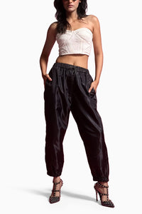 Tonal ivory bustier bralette, fully embroidered with thread and hand-applied pearl beads. Corset-inspired shape with smocked back for a comfortable fit. Fully lined. Detachable, adjustable straps included. Paired with Black relaxed fit parachute jogger pants. Elasticated waistband with drawstrings, front zipper, and fully lined. Features side and back pockets, elasticated cuffs with concealed zippers. Cuff zipper can be worn closed for a jogger look or opened as a straight pant.