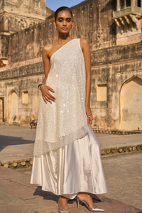 Ivory top with pearl, sequin and bead embroidery placed on a foiled patterned mesh. One shoulder top with A-line cut. Garment is fully lined. Paired with a draped culotte pant in an ivory satin fabric. Harem pant inspired shape. Semi elasticated at the waist with zip and hook/eye closure on the side. Flared at the hem.