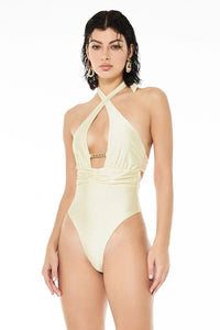Make a sleek statement in the Pearl Halter Neck Swimsuit. Designed with a versatile neckline, gathered waistbelt, and a flattering high-leg cut, it’s the perfect blend of elegance and allure for sun-soaked days.