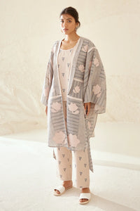 Featuring Pearl Kimono Set by Cotton and Clay, a delicate hand block printed silk voile ensemble. The kimono is adorned with intricate floral patchwork and French knots, paired with a sleeveless inner top and trousers—offering a graceful blend of texture and elegance in pearl with stone blue prints.