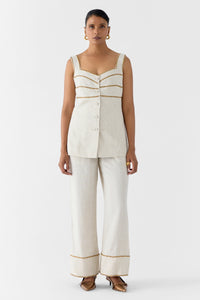 The Pearl Linen Blazer & Trousers Co-ord crafted from our stunning viscose linen fabrication, trans-seasonal, is a statement piece. This blazer, in our pearl cream, is hand embroidered with studs and has a front opening. It is lined and sleeveless. The cut of the bust is fitted and it has side slits. It is paired with our hand embroidered straight linen trousers. Wear it with heels for an elegant look.