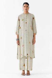 The Pearl Polka Dot Straight Kurta & Pants crafted from our stunning vegan silk fabrication, trans-seasonal, is a statement piece. This set, printed in our jewels polka dot print, is a two piece set. The kurta is a straight fit with high side slits. It has a front opening with Swarovski details and hand embroidered with beads. It is paired with our  matching onyx straight pants with an elasticated back. Wear it with heels for an elegant look.