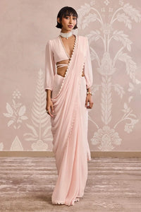 Effortlessly chic, the Pearl Saree Set pairs a placement-embroidered georgette blouse with dramatic exaggerated sleeves alongside a sleek flat saree and crepe petticoat. This contemporary take on tradition balances bold design and subtle elegance for standout style at any event.