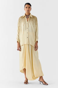 The Pearl Studded Shirt & Knot skirt crafted from our stunning viscose rapier fabrication, trans-seasonal, is a statement piece. This shirt, hand dyed in our pearl cream, has a batwing fit. It has hand embroidered studs and a front opening. It is paired with our knot skirt with a side zipper. Wear it with heels for an elegant look.