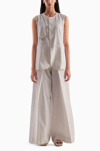 Introducing the Pearl Whisper – a sophisticated white waistcoat dress paired with chic baggy trousers. Crafted from the finest materials, this luxurious set embodies effortless refinement, making a bold statement for any occasion.