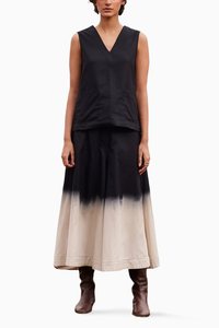 A black twill cotton co-ord set. The tunic comes with a V neckline, side slits and back button opening with two front patch pockets. The flared trouser comes with front button opening, elasticated back and dip dyed hemline with two pockets.