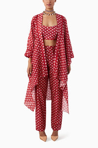 Make a bold statement with our Pema Red Boota cape and bustier set, paired effortlessly with pants. Created from luxurious Chanderi fabric, this 3-piece ensemble combines elegance and striking design for a captivating look.