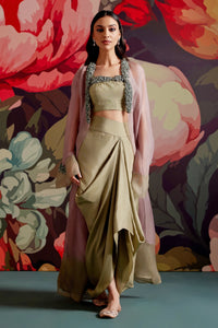 The Pembe Jacket Skirt Set features a rosewood silk organza cape paired with an almond drape skirt and inner. Adorned with small roses, cut beads, and organza balls, it combines intricate detailing with luxury—perfect for weddings, receptions, and evening galas.
