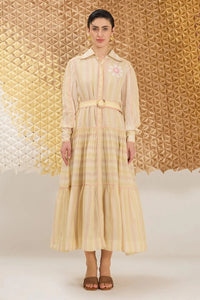 Crafted from hand woven Cotton Silk fabric this dress is a button down flowy dress with voluminous skirt resembling peony petals. Soft pastel shades like blush pink, pale white and soft peach create a romantic, ethereal vibe. Finished with a belt and hand embroidered flower this dress is an embodiment of grace and beauty.