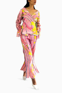 The Peony - Wrap Top Co-Ord Set showcases the inside-out concept, where each seam and stitch is proudly displayed in contrasting pop blue thread, adding an edgy, modern touch. Crafted in soft pink with touches of yellow, the wrap top allows for a customizable fit, while the style-lined pants provide a sleek silhouette. The visible outside seams and out stitch details not only highlight the high level of craftsmanship but also embrace the raw beauty of every line and detail.