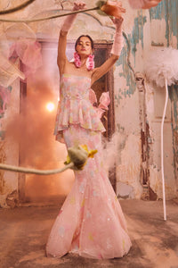 Featuring a gradient corset-style peplum top crafted from delicate tulle, this piece is adorned with multi-color gitch embroidery that adds intricate and vibrant detailing. The corset structure accentuates the waist, while the peplum hem creates a flattering and elegant silhouette. It is beautifully paired with a fishtail skirt, also made from tulle and embellished with the same multi-color gitch embroidery. The skirt’s fishtail design provides a dramatic, flowing effect, harmoniously complementing the top’s sophisticated look. T