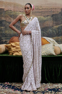 Pink Lucknowi saree,adorned with intricate hand-embroidery and small mirror tassels attached to border and pallu is paired with mirror work blouse on gota lined with chanderi silk.