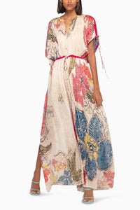 Featuring the Periwinkle Bandhani Kaftan with Drawstrings by Saaksha & Kinni's Eclat Collection. This ivory cotton silk kaftan features a periwinkle Bandhani print, with a drawstring waist, adjustable drawstring sleeves, and customizable side slits for a versatile, flattering fit.