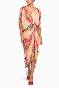 Featuring the Periwinkle Bandhani Pleated Sari-Style Dress by Saaksha & Kinni's Eclat Collection. This elegant peach cotton silk dress features a periwinkle Bandhani print, a two-shoulder design with hand-micro pleats, and adjustable sleeves and length for a perfect, customizable fit.
