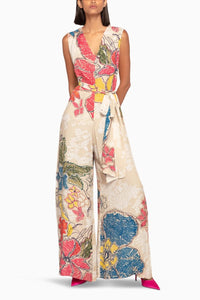 Featuring the Periwinkle Bandhani Satin Jumpsuit by Saaksha & Kinni's Eclat Collection. This elegant ivory satin jumpsuit features a periwinkle Bandhani print, sleeveless design, and a detachable belt for a versatile, flattering silhouette. Perfect for a chic and contemporary look.