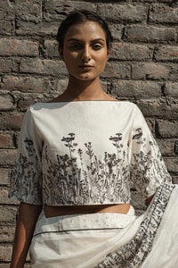 This boat neck top, crafted from floral printed chanderi, features overlapping shoulders and a boxy silhouette for a modern yet timeless look. With three-quarter sleeves and subtle tape detailing, it creates a feminine focal point. A side zipper with hook adds functionality, making this adaptable wardrobe essential perfect for elevating any everyday ensemble.
