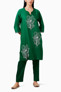 This emerald kurta and pant set showcases fine craftsmanship with three hand-embroidered floral designs, each featuring pearl fringe for added charm. The full sleeves are finished with scalloped pearl embroidery, enhancing the refined look. The relaxed kurta features high side slits for comfort and style. Paired with straight-fit, ankle-length pants with an elasticized waistband and functional side pockets, this set offers a perfect blend of elegance, comfort, and versatility for any occasion.