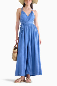 Featuring the Pia Maxi Dress by House Of Exotique is a stunning piece. With hand-braided tie-ups and a slit detail, it boasts a V-neckline. Crafted from dobby fabric in a captivating blue hue, it's a perfect blend of elegance and allure for any occasion.