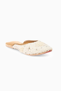 Featuring Perle Juttis by 5 Elements by Radhika Gupta. With an open back, this pair is classy, elegant and graceful. Set on a white base, studded with elegant creamy pearls that makes a beautiful flower in the middle and clustered with silver rhinestones that adds a graceful sparkle to the whole shoe.