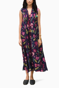 Our Carnation dress is a sleeveless dress with a Chinese collar. It, a front open shirt dress adorned with beautifully handcrafted buttons and mesmerizing foliage print. This flowy dress in Persian blue color has pleats on the front and back and has side pockets. It comes with a solid cotton slip.