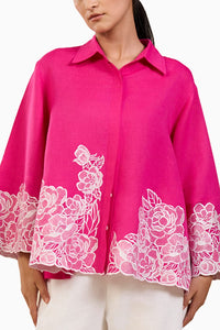 Petal Garden Shirt in vibrant fuchsia colour: a statement of femininity and flair. The flared sleeves add a whimsical touch, while intricate hand embroidery exudes artisanal charm. Elevate any occasion with this captivating piece, designed to make you feel truly exceptional.