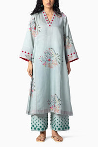 Petal Kurta in haze, this chintz-inspired floral printed one-kali kurta is adored with fuchsia towel embroidery and features side pockets and a v-neck collar in haze, joined with red machine jali.