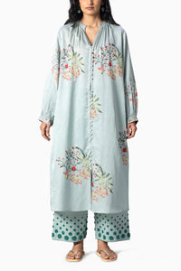 Petaline Kurta in haze, this silk cotton satin kurta is adorned all over with a chintz-inspired floral print with a hint of red, featuring delicate adda work and gentle gathers around the collar for softness.