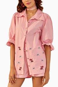 Featuring the Petunia Co-ord Set from Sttavoss's Everbloom Collection. Elevate your mood and style with this charming poplin shirt and shorts ensemble. Adorned with gorgeous embroidery, it's designed to perk up your day. Crafted for comfort in pink poplin, it's the perfect choice for any occasion.
