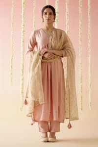 Fabric- Kurta: Chanderi, Pant: Chanderi, Dupatta: Crushed Dobby Tissue Color- Petunia peach Components- 3 Product Code- SVENEROGMKSD19