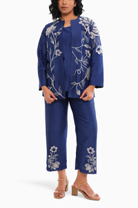 Introducing our elegant co-ord set, featuring a comfortable sleeveless top paired with a fully embroidered jacket showcasing intricate appliqué work. The ensemble is completed with matching embroidered pants that include convenient pockets, offering a perfect blend of style and practicality. This timeless look seamlessly combines elegance with comfort, making it a versatile choice for any occasion.