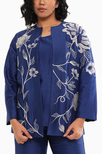 Introducing our beautifully crafted jacket, designed to offer both comfort and sophistication. This piece is adorned with intricate embroidery and detailed appliqué work, showcasing a perfect blend of elegance and craftsmanship. The fine embroidery adds a touch of artistry, while the meticulous appliqué work enhances the jacket's refined aesthetic. Ideal for layering over a variety of outfits, this jacket combines style with comfort, making it a versatile addition to any wardrobe.