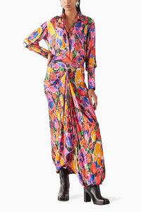 The Petunia Shirt & Draped Skirt Co-ord crafted from our stunning Vegan Silk fabrication, trans-seasonal, is a statement piece. Made in our hand drawn chaotic petunia print, it is a 2 piece set. With a front button opening and wide cuffs, it is chic. Featuring a draped knot skirt, this skirt has a side zipper and can be styled in different ways. Paired with our matching Petunia Draped Skirt. Wear it with heels for an elegant look.
