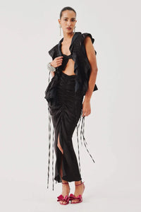 Featuring the Phoenix Mashru Bib in Black from Aroka's Signature Collection, a hand-smocked bib crafted from lustrous vegan mashru, showcasing intricate detailing that strikes a balance between structure and fluidity. Its loose silhouette offers a contemporary take on the classic blouse, finished with adjustable front and side tie-ups for versatile, personalized styling.