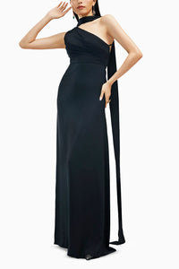 Featuring Phoenix One Shoulder Dress With A Scarf by Brinda Sneha by their Love Locked Collection. It's a black full-length gown that features a one-shoulder draped bodice that flows seamlessly into a straight skirt, creating a sleek and graceful silhouette. The strappy back adds a hint of allure, while a thin scarf completes the look by adding a touch of chic refinement that makes it perfect for cocktail events, evening parties, and proms.