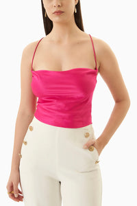 The Piccola top is a playful cropped top, that features an open back and ties at the back. It has a drapy neckline and comes in a vibrant fuchsia pink satin viscose.