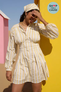Our Pichola Dress is designed using striped cotton fabric. It features a hidden button placket, full sleeves, a concealed zip, a fit and flare silhouette, and a soft mulmul inner lining for a comfort fit.