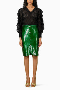 This Pigment Green Sequin Sheath Skirt features a sleek silhouette with a front slit and elegant gold pearl buttons. Striking and glamorous, it pairs effortlessly with refined separates, making it a standout choice for dinner parties, receptions, or any elevated evening occasion.