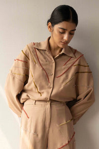 Featuring the Pinch Lines Shirt, a collared silhouette hand-embroidered with delicate pinch embroidery lines, elegantly tracing across the drop shoulder for a refined, textural finish.