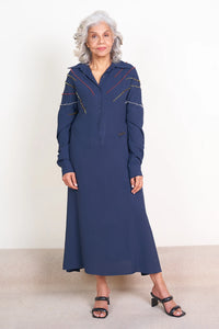 This blue pinched shirt dress features an easy, relaxed fit with a flared bottom panel that falls gracefully at the ankle. Handcrafted asymmetrical pinched PVC embroidery decorates the front yoke, paired with a waist-defining belt, front button closure, convertible collar, and polished full-sleeve cuffs.
