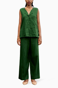Featuring a forest green linen co-ord set. The tunic comes with front button opening, side slits and front patch pocket. Comes with a regular trouser with front button opening and side pockets.