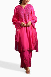 Featuring Pink Aaleyah Embellished Kurta Set in Habutai Silk. Hand Embellished in Pink   hues. Kurta is embroider, Paired with pants, Styled with tone on tone organza dupatta.