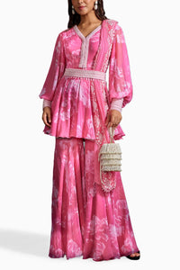 Featuring Pink Abia Printed Kurta Set in Crinkle Chiffon. Hand Embellished in Pink Printed hues. Kurta has a front fastening printed with blouson full sleeves, it is backless and has a drawstring. Paired with Sharara, Front belted and back elasticated. Styled with Crinkle Chiffon Embroidered Dupatta, It has an embroidered belt drawstring.