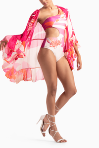 The Pink Abstract Muse one-shoulder bodysuit is a contemporary masterpiece that marries avant-garde design with a touch of elegance. The soft pink hue is delicate and captivating, creating a beautiful backdrop for the abstract muse pattern. The side cut adds a touch of boldness, revealing just the right amount of skin, while the chiffon cape detailed with ruffles at the sleeve introduces a whimsical and dynamic element. This bodysuit is the epitome of modern fashion's creative brilliance, offering a unique blend of sensuality and style that's perfect for making a striking and memorable impression at any special event.