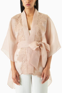 Signature cape top in our new pink shade and intricate floral laced details.