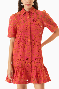 Fea turing Pink a mnia Dress by Miri Pret from Born To Be Free. Eleva te your style in a stunning combina tion of pink a nd ora nge Broderie a ngla ise. The dress ma de of pure cotton ha s a front opening a nd is deta iled by bea utiful bea ded buttons.
