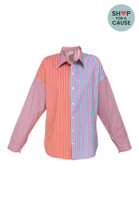 Agra Shirt is handcrafted using up cycled striped cotton fabrics. It features colorblocked fabrics stitched together and has an oversized fit with long sleeves, a yoke with a back pleat, a rounded hem which is longer at the back and front button closure.