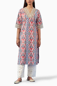 Featuring Pink Aprajita lawn cotton kurta and palazzos with crochet lace detailing.