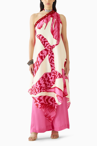 The Pink Aphrodite One Shoulder Kurta & Pants Co-ord crafted from our stunning vegan silk fabrication , trans-seasonal, is a statement piece. The co-ord, made in our hand drawn Aphrodite print, has a relaxed fit. With one sleeve, the piece has hand embroidered fringe and sequin lace. Featuring a summery look, it is paired with hand dyed pink flared trousers with a waistband and pockets. Wear it with heels for an elegant look.ÂÂÂ